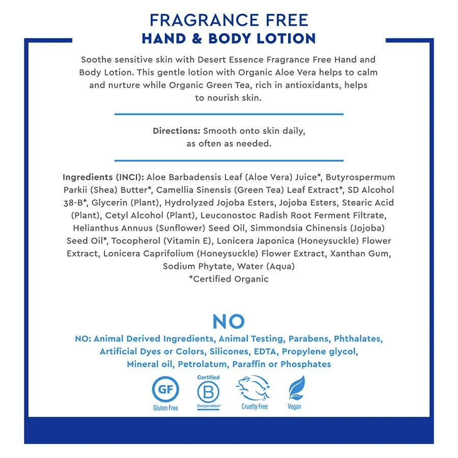 Desert Essence Fragrance-Free Hand & Body Lotion 8 fl. oz. Desert Essence Fragrance-Free Hand & Body Lotion 8 fl. oz. Desert Essence Fragrance-Free Hand & Body Lotion 8 fl. oz.