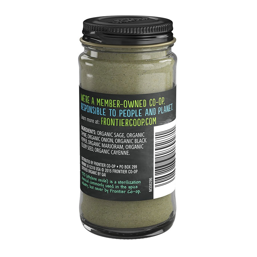Frontier Co-op® Poultry Seasoning Organic is a traditional seasoning--headed by sage and thyme--that partners perfectly with poultry and stuffing. Try it with other savory ingredients, too.