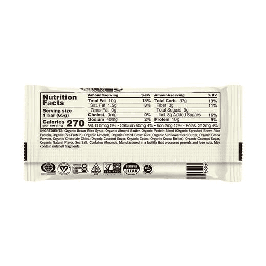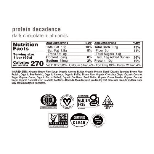 Organic chocolate chips and vegan dark chocolate blend with almonds for a high-protein treat for any and all chocolate-lovers! Get all the rich, chocolatey goodness of a brownie in a guilt-free snack with our Protein Decadence MacroBar®. Our blend of organic cocoa and vegan chocolate chips is sure to satisfy any chocolate lover's craving. With an added bonus of 10 grams of protein per bar, our Dark Chocolate + Almonds MacroBar will keep your sweet tooth and wellness goals in check!
