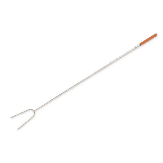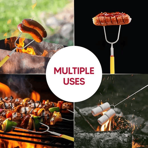 HIC Kitchen's Extendable Roasting Forks extend to 35.25-inches to roast foods at a safe distance away from open flame. Wide 2-prong design holds more food securely, up to 0.75-pounds; food slides on and off the pointed tips easily; reusable, food safe, and flame safe forks. Ideal for toasting marshmallows for s'mores or hot chocolate, roast hot dogs, kabobs, chicken, and more around campfires, bonfires, firepits, and more. Color-coded handles are insulated and cushioned for comfort and clearly identify each person's fork; soak fork tips in hot water then hand wash. Set of 6; each measures 11 x 3 x 0.25-inches; includes 13 x 6-inch canvas storage bag.