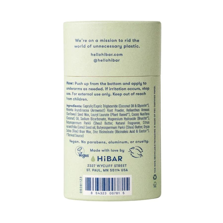 Sunflower wax from sunflower seeds help create the perfect consistency for easy application. Moisturizing shea butter adds glide without the risk of that embarrassing white residue. Rice bran, extracted from the outer layer of rice, is naturally rich in skin nourishing Vitamin E. A dash of natural lime seed oil helps keep body odor at bay. It's time for change. Instead of one of those old fashioned plastic deodorant tubes, HiBAR Deodorant comes in a uniquely-designed, easy-to-use, 100% recyclable cardboard container. When it's empty, just pop it in the recycling bin. Ingredients are safe and gentle on your skin, but at the same time, they deliver the absolute assurance of all-day protection.