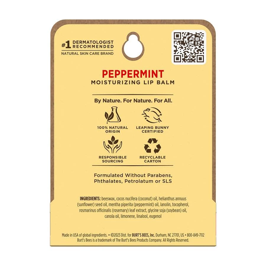 The essential Burt's Bees® Moisturizing Lip Balms nourish and make your lips feel luxurious. Infused with botanicals like peppermint extracts and Beeswax to richly moisturize and soften lips, the nourishing oils and butters will make your lips feel juicy, happy and healthy. Let your lips dance with a refreshing Peppermint tingle that will help get you in the spirit of the season and ready for under the mistletoe. With a matte finish and moisturizing balm texture, this tube of tint free soothing lip balm glides on smoothly to nourish dry lips while keeping them revitalized and hydrated. Conveniently tuck a tube into a pocket or purse so that you can keep natural, nurturing lip care handy. This 100% natural beauty product is formulated without parabens, phthalates, petrolatum and SLS and will beautify and revitalize your lips. Use these natural origin Burt's Bees® Moisturizing Lip Balms to make lips feel their best.