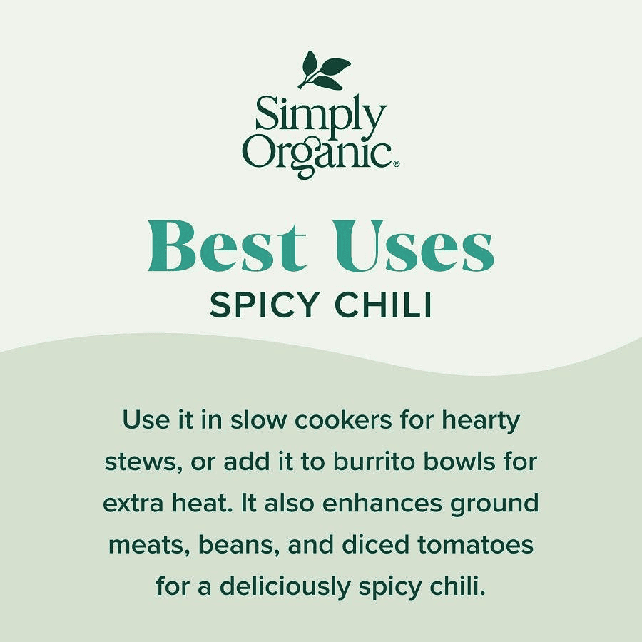 Add a little spice to your life with Simply Organic® Spicy Chili Mix. This lively mix of organic spices easily creates a wholesome chili with a serious kick. Featuring ground chili peppers from New Mexico, the "Chili Capital of the World", along with cayenne and cumin for mouth-watering heat, earthy smokiness and intense flavor.