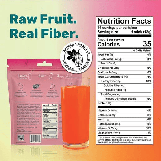 Over 75% Organic Baobab Fruit & Coconut Water Powder. Natural Electrolytes. 5g of raw, unprocessed prebiotic fiber from Baobab. Natural Polyphenols(Antioxidants) for inflammation.